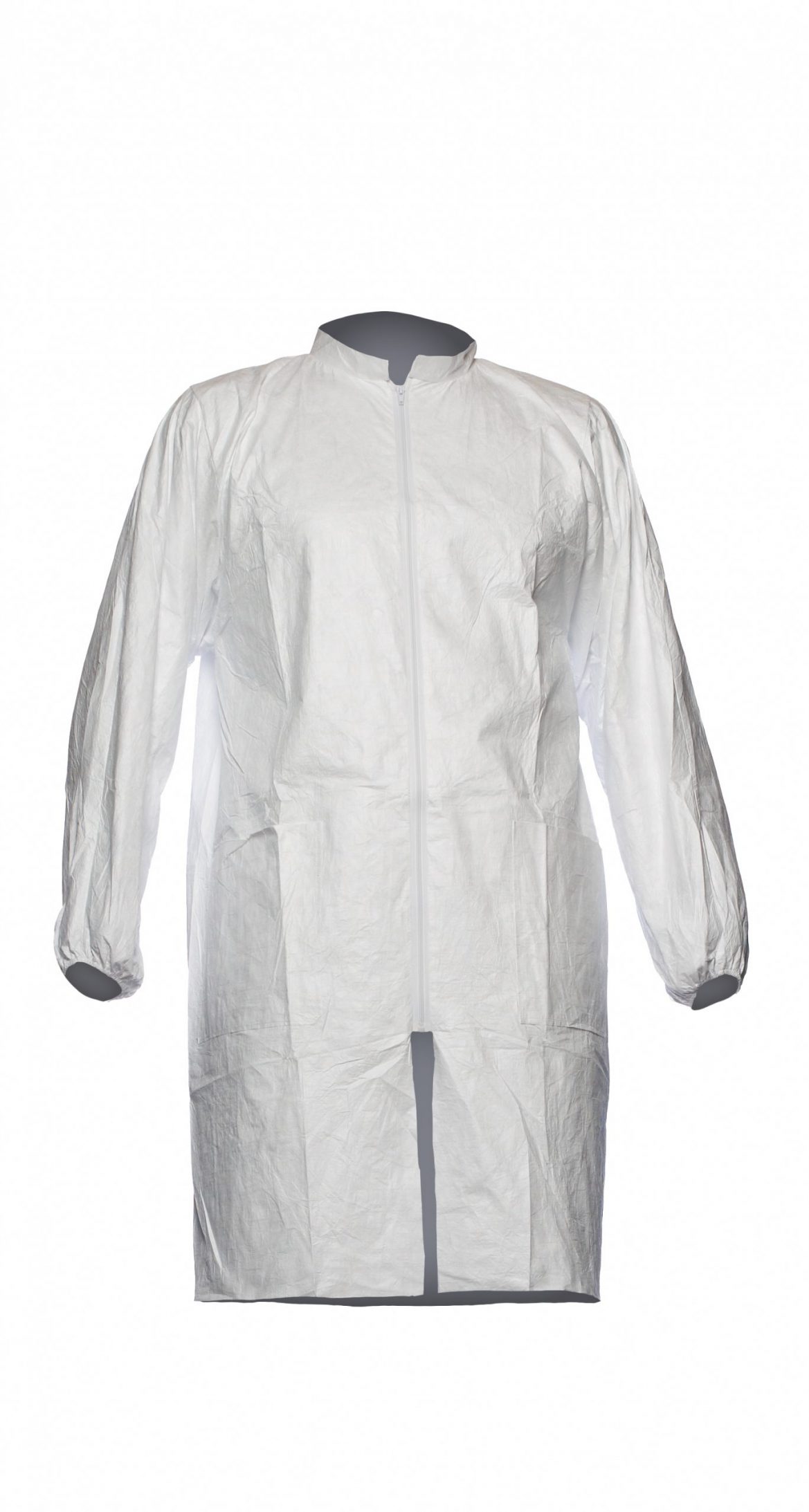 Laborkittel mit Reißverschluss und Taschen TY PL30 S WH 09, Modell PL309, Genähte innenliegende Nähte, Kragen, Reißverschluss, 2 Taschen, Tunnelgummizüge an den Armabschlüssen. CE-zertifiziert gemäß (EU) 2016/425, Chemikalien-Teilkörperschutz Kat. III, Type PB [6-B], gemäß EN14126, antistatisch (EN 1149-1).