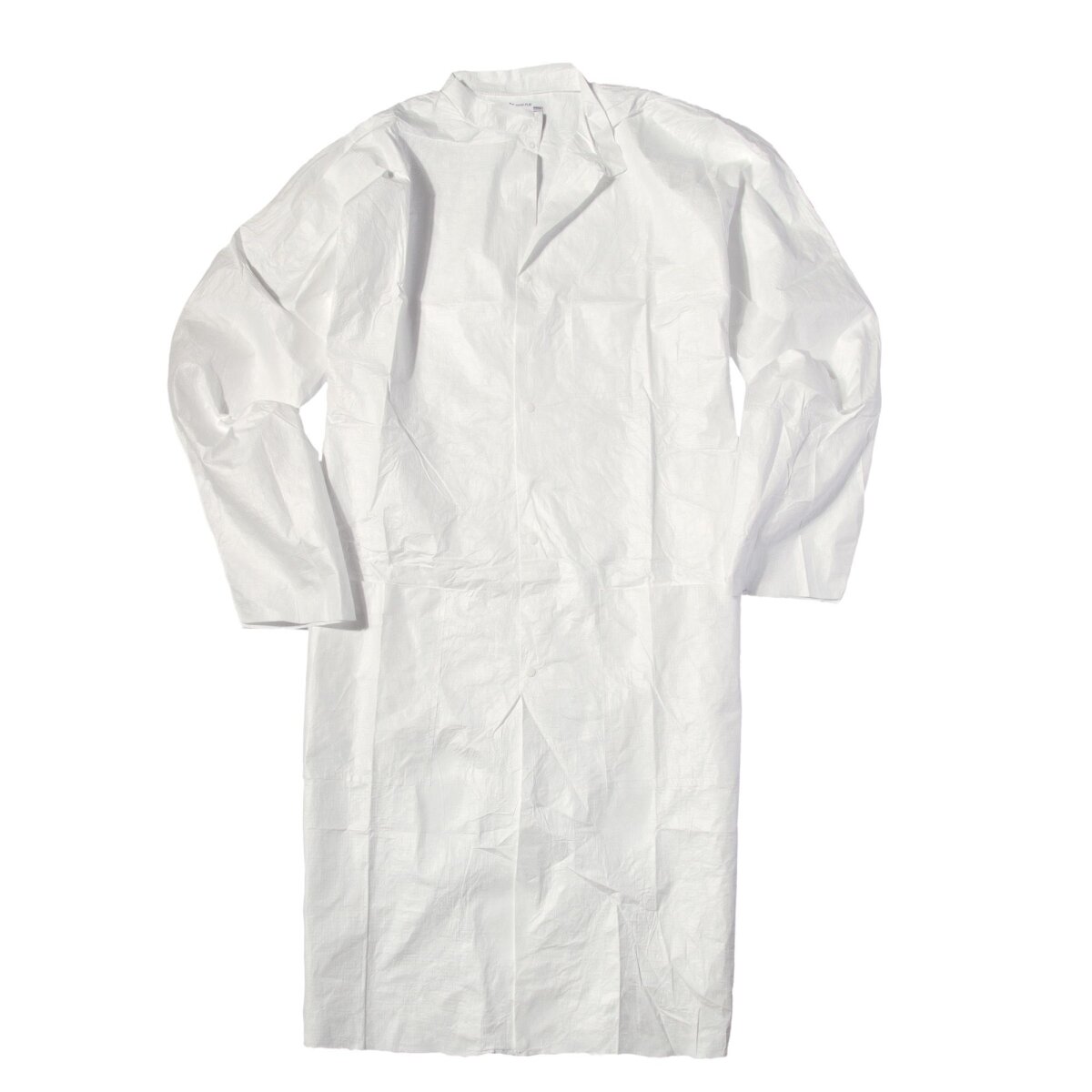 Tyvek Kittel IC 702 S WH 00 (lose verpackt), Versäuberte Nähte, Eingefasster Ausschnitt mit Bändern, Strickbündchen, Gummizug ab vorderer Taillenmitte. CAT III, Type PB [6-B], EN 14126, certified acc. (EU) 2016/425, suitable for ISO-class 6-9.