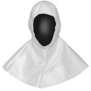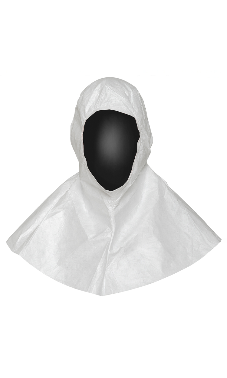 Tyvek Kapuze mit Gummizug IC 668 B WH MS. Eingefasste Nähte, Eingefasste Kapuzenöffnung für geringe Partikelabgabe, Große Gesichtsöffnung, Einstellbare Gummizüge mit Schlaufen. Einheitsgröße. In validiertem Verpackungssystem mit dualem Barrieresystem verpackt und gammasterilisiert mit SAL 10(log-6) (ISO 11137-1), geeignet für ISO-Klasse 5, Zertifiziert nach (EU) 2016/425, Teilkörperschutz, Kategorie III, Typ 6-B, gemäß EN14126.