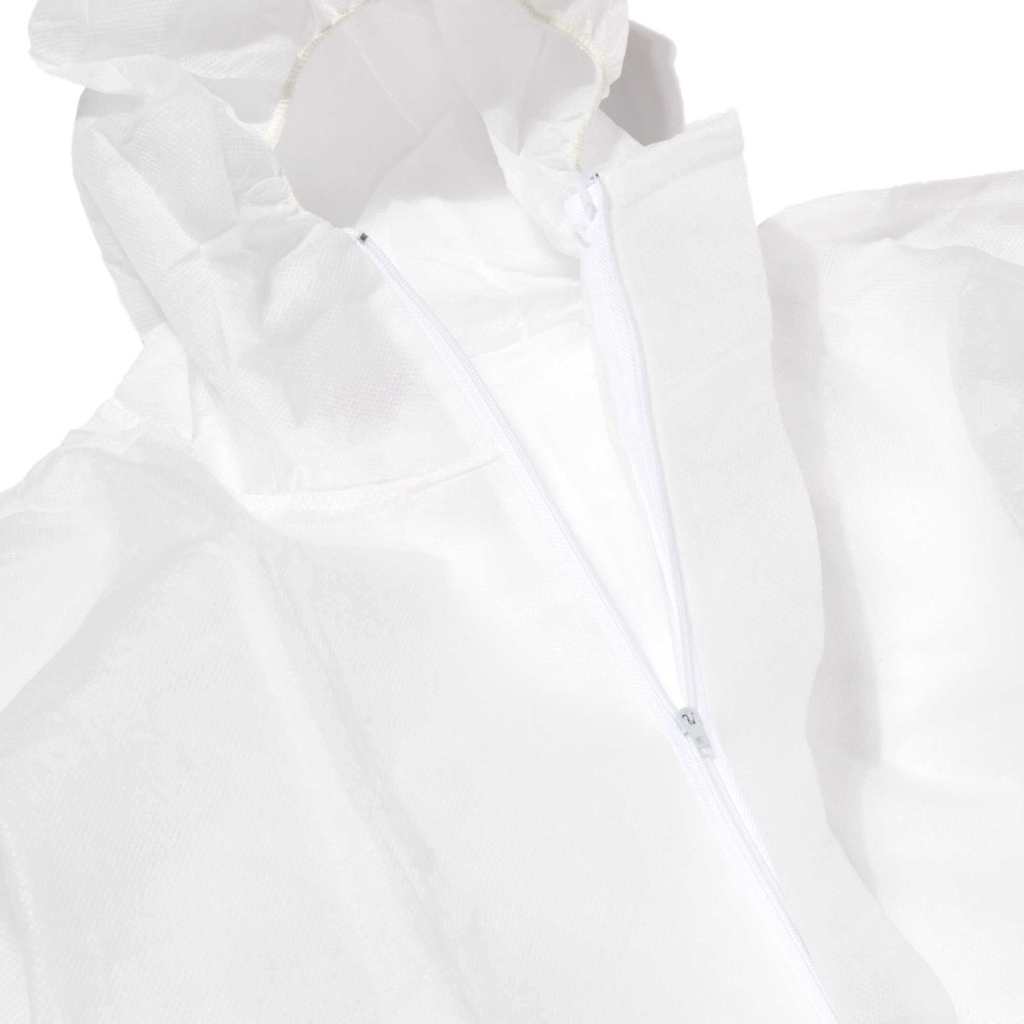 Gummizüge an Ärmeln, Beinen und Kapuze, Ergonomische dreiteilige Kapuze. Taillengummi für individuelle Größenanpassung, Abdeckblende über dem Reißverschluss bis zum Kinn, außenliegende Overlock-Naht, Großzügig geschnittener Schrittbereich, eingearbeiteter Zwickel, Gewicht: 50 g/m², Material: Polypropylen Spinnvlies.